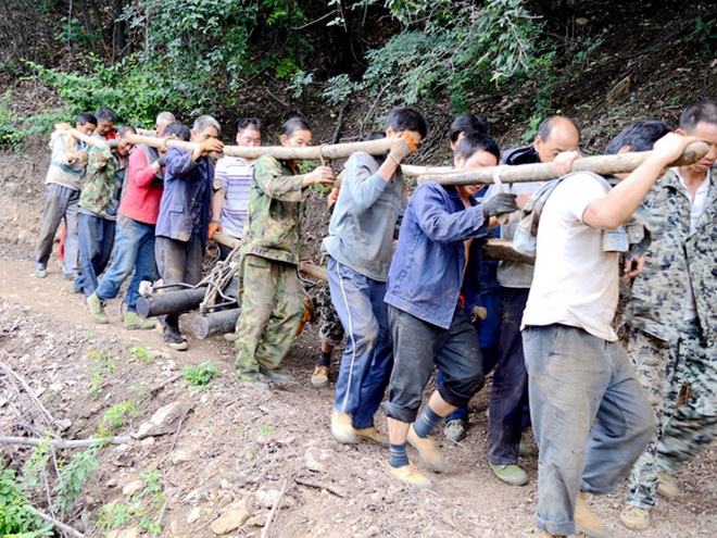 圖為鉆機施工人員在搬運設備。