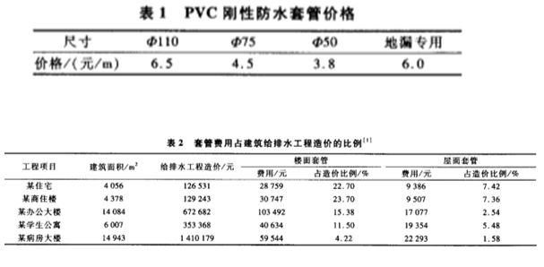 建筑施工給排水工程施工說(shuō)明規(guī)定:管道穿越樓面、屋面、水箱,需預(yù)埋剛性防水套管。工程實(shí)踐表明,防水套管在一定程度上能夠解決衛(wèi)生間樓板的滲水問(wèn)題。而剛性防水套管可以解決滲漏問(wèn)題,但是費(fèi)用也不低,PVC剛性防水套管價(jià)格見表1,防水套管費(fèi)用占建筑給排水工程造價(jià)的比例見表2。