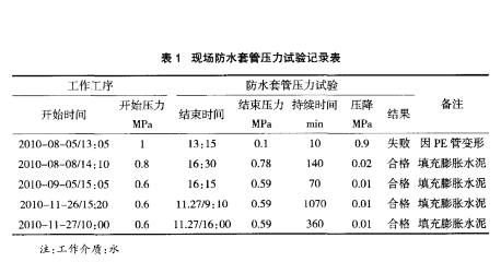 經(jīng)過一個(gè)月的反復(fù)試壓試驗(yàn),套管沒有再發(fā)現(xiàn)滲漏現(xiàn)象,試壓成功。現(xiàn)場防水套管壓力試驗(yàn)記錄數(shù)據(jù)詳見表1。