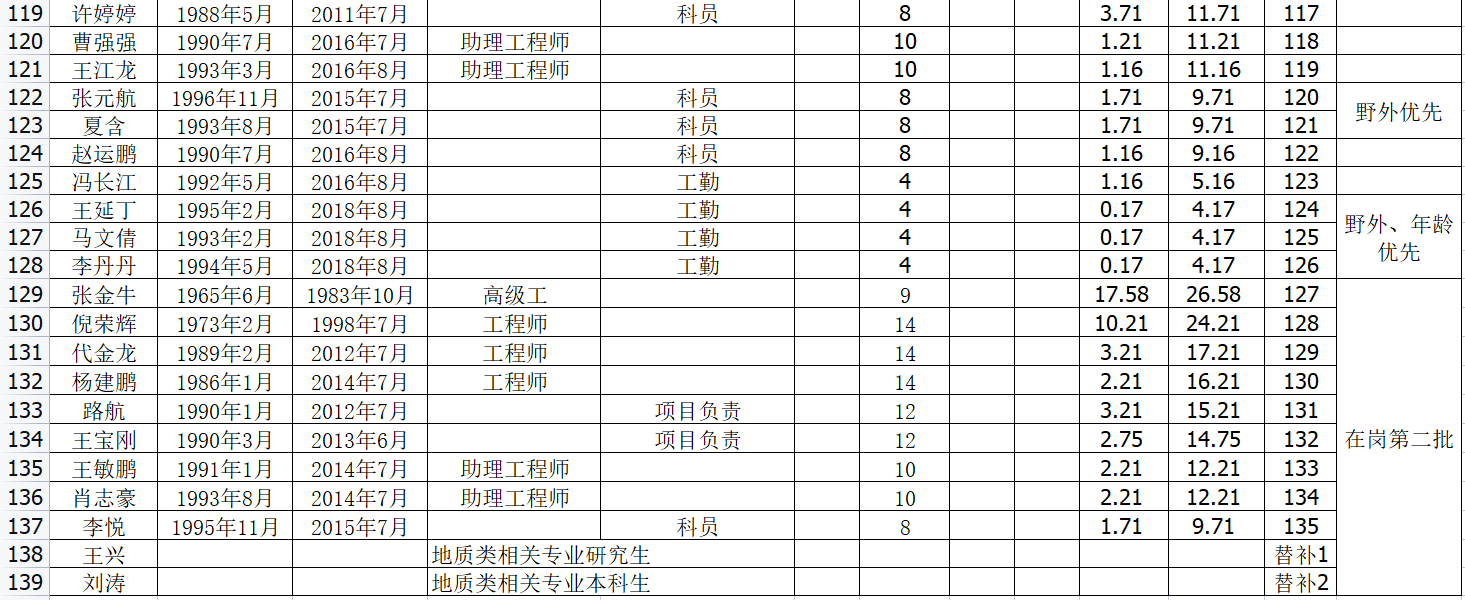 截至2021年底,我公司現有在冊職工421人,其中事業身份373人,企業身份48人。在崗職工182人,下崗及內退239。各類專業技術人員116人,其中地質類專業技術人員83人,其他專業技術人員33人。教授級高工1人,高級工程師22人,工程師41人;初級及以下52人,管理人員16人,工人289人,其中技師15人。